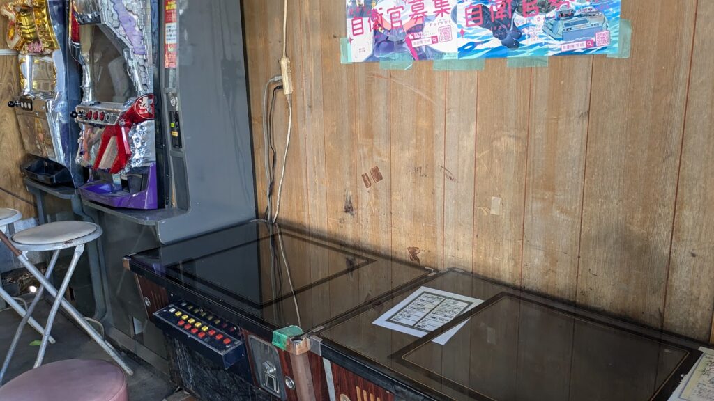 店内の炭にひっそりと置かれるテーブルゲームとスロットマシン。