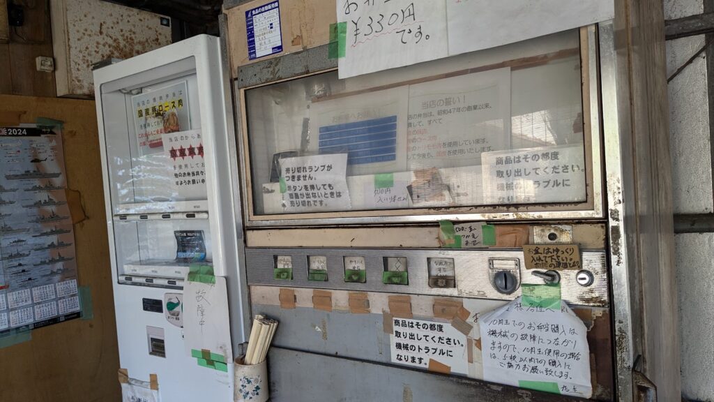 あらいやオートコーナー名物の自動販売機。とっくの昔に生産が終了した。昭和の自動販売機なので、古く見えるのは当たり前なんですね。