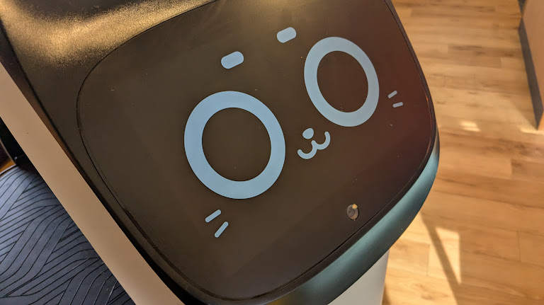 寝ている時とは違う、凛々しい顔のネコ型配膳ロボット。