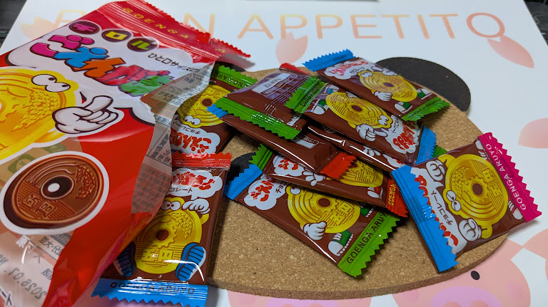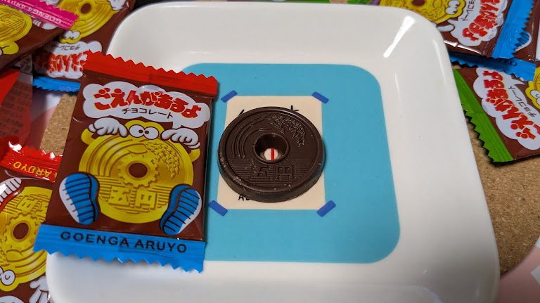 - わかり易いデザインは5円玉硬貨。当時は値段も5円で計算しやすかった思い出。