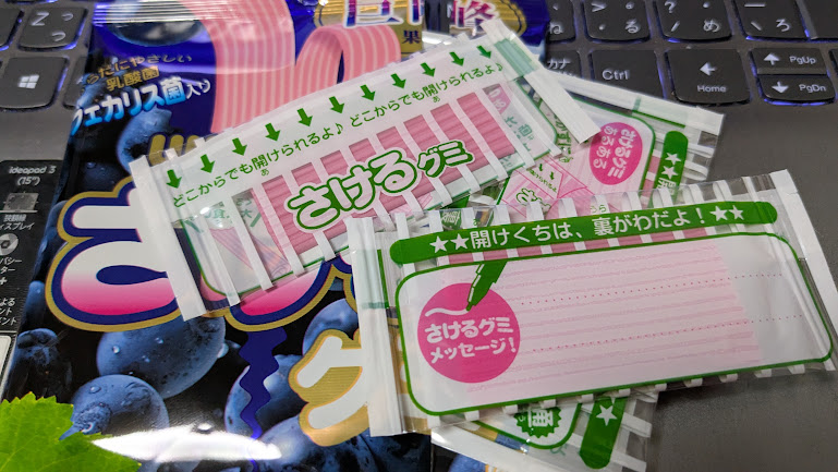 気軽に『一枚ちょうだい・あげるよ』といったシェアも可能であり、従来からよく見た個包装のお煎餅やチョコに混ざって『個包装のグミ』なんていうシチュエーションも可能ですね。