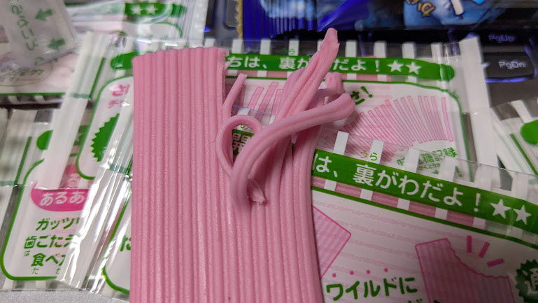 お楽しみ度 ☆☆☆☆☆ 予想外に柔らかいグミ本体はうまく割くことができない。簡単に引きちぎれてしまうため、1本1本バラすのはしなん技。意外と暇つぶしになったり。