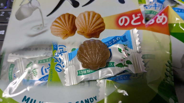 | 見た目 | ☆☆☆☆ | はじめから何故かホタテ貝(?)イメージした形ののどにスッキリのどあめ。 ホタテ貝とのど飴の因果関係は昔から不明…。 |