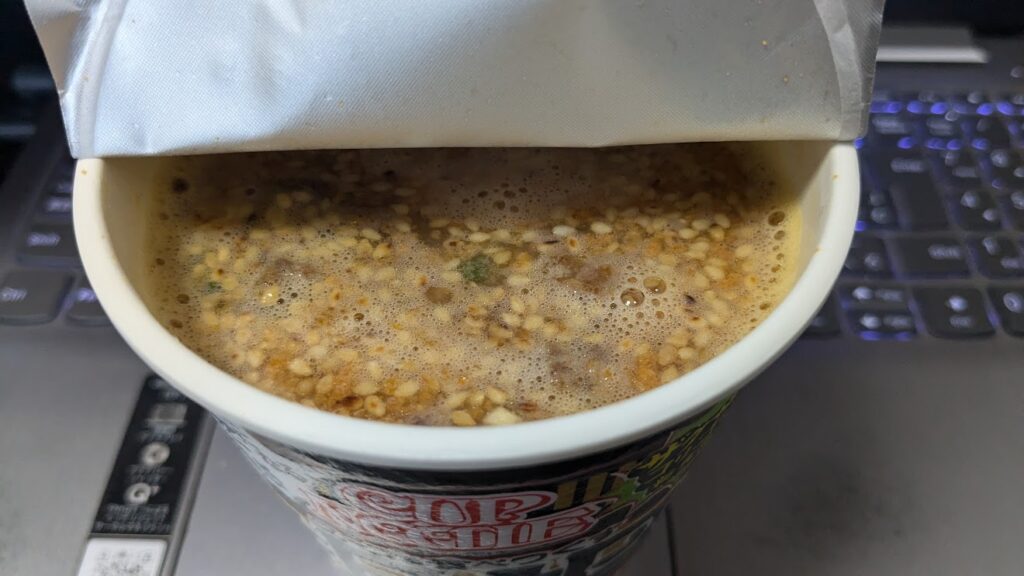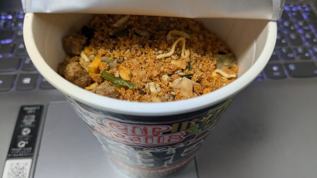 カップヌードルは容器がスマートなため、必然的に湯の必要量がどんぶり型と比べて少なくなりますが、その少なさをうまくザクザク感につなげていると思います。