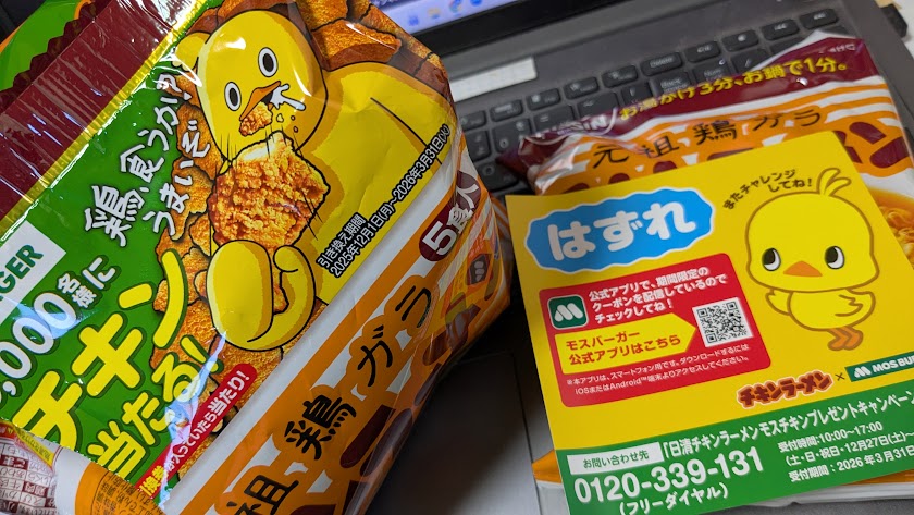 どーでもいいけど、毎年必ずモスチキンキャンペーンの時に無意味に買うのですが、当たった試しがありませんねぇ…。