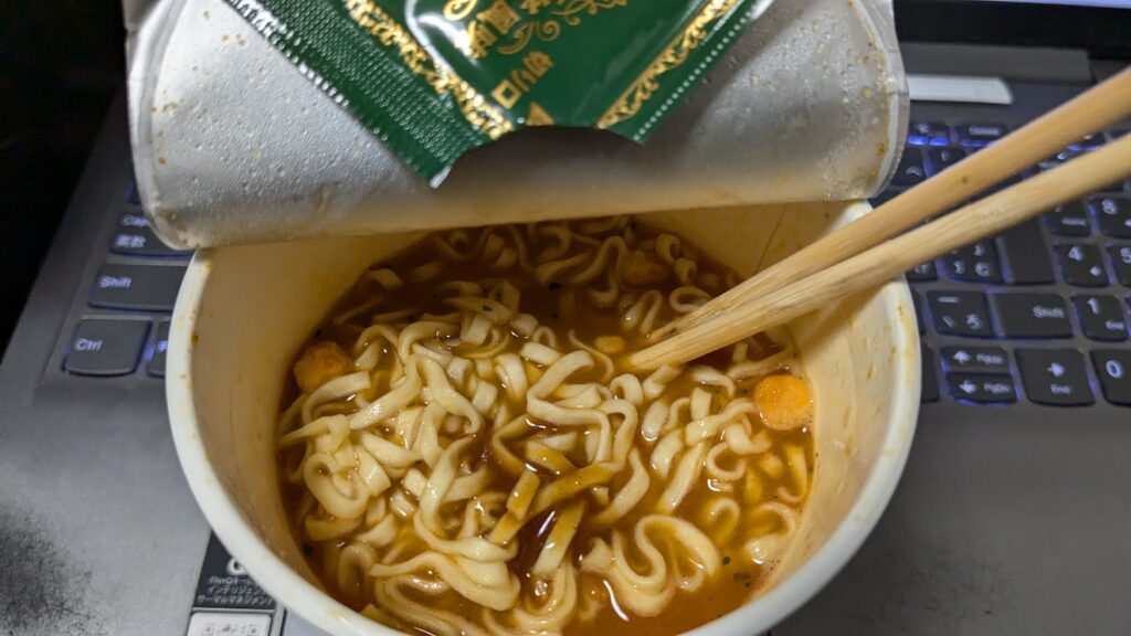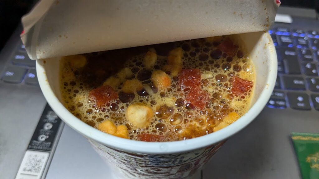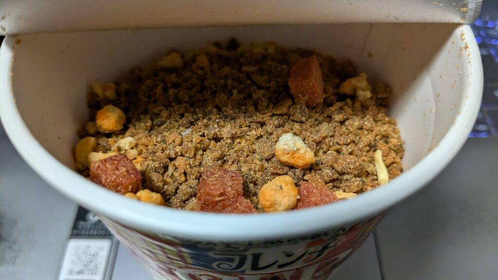 この頃のカップヌードル系の期間限定品には小袋が付属される場合が多かった印象ですが、確かに小袋の中の液体を入れる事で風味が大幅アップしますね。